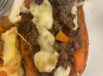 Pieczone słodkie ziemniaki z duszoną szarpaną wołowiną i sosem czosnkowym.