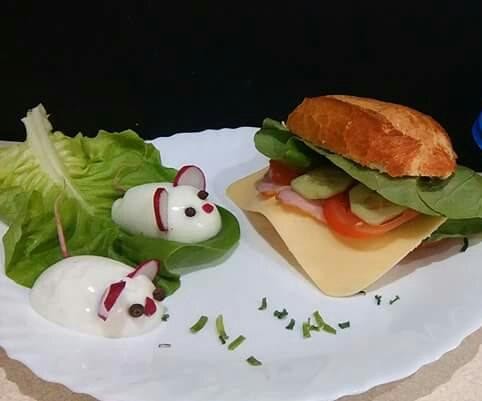 Ryż z warzywami zapiekany pod chmurką z białka. Dodatkowo można podawać z połówką grejpfruta.