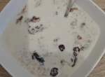 - Ciepłą mieszanką zalej płatki, a na wierzch wysyp drobno pokrojone owoce.