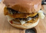 Przygotuj burgery – spód każdej bułki posmaruj majonezem i nałóż po garści zieleniny. Kotlety z kurczaka w chrupiącej panierce, pomidory pokrojone w plasterki i krążki czerwonej cebuli.