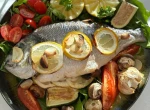 rybę nacinamy i faszerujemy plastrami pomarańczy i ziołami. Doprawiamy solą i pieprzem. Układamy na blachę. Ziemniaki podgotowujemy 10 min. Kroimy na ósemki. Doprawiamy solą, pieprzem i ziołami, układamy na blachę. Warzywa kroimy i doprawiamy i układamy obok ryby i ziemniaków. Całość spryskujemy niewielką ilością oliwy z oliwek. Pieczemy w temperaturze 180 st. przez około 30-40 min.