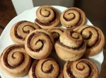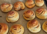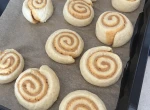 9. Smarujemy ciasto zrumienionym masłem i posypujemy cukrem z przyprawami, zwijamy ciasto wzdłuż długiego boku, ostrym nożem kroimy plastry o grubości ok 5 cm, układamy je na blaszkach wyłożonych papierem do pieczenia, pozostawiamy ok 2 cm przestrzeni, odstawiamy do wyrośnięcia na ok 60 min