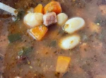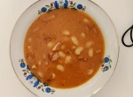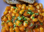 Cebulę i czosnek obierz, a następnie pokrój na mniejsze kawałki. Warzywa podsmaż delikatnie na maśle, dodając kolejno pokrojoną kiełbasę i boczek. Składniki smaż na małym ogniu przez około 15 minut, od czasu do czasu mieszając. Po upływie wyznaczonego czasu dodaj fasolę i pomidory. Duś pod przykryciem ok 30 minut.