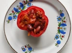 - Papryki umyj, przekrój na połowę, usuń gniazda i wypełnij ciepłym chilli.