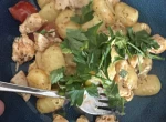 Kluseczki wrzucaj partiami do wrzącej wody i gotuj do momentu, aż wypłyną na powierzchnię. Odcedzone wyłóż na talerzyk. W między czasie rozpuść masło na patelni, dodaj pietruszkę i smaż przed chwilę, po czym polej nim gnocci.