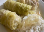 Farsz:Cebulę kroimy w drobną kostkę. Pieczarki oczyszczamy i kroimy w bardzo drobną kosteczkę. Na patelni roztapiamy masło i podsmażamy cebulę z szczyptą cukru, dodajemy pieczarki i całość podsmażamy do momentu, aż woda z nich odparuje. Doprawiamy solą i garam masala. Do dużej miski wsypujemy kuskus, zalewamy go ciepłą wodą (nie gorącą) ok. 0,5 cm powyżej kaszy. Kuskus powinien wchłonąć całą wodę (czas ok. 5- 8 min). Dodajemy do niego pieczarki z cebulą, doprawiamy papryką chili, solą i pieprzem. W dużym garnku zagotowujemy wodę z dodatkiem soli i 1 łyżeczki cukru.Kapustę sparzamy i przekładamy na cedzak.Z każdego liścia, delikatnie nożem ścinamy grube końce. Na desce układamy liść kapusty, nakładamy od strony łodygi farsz i zawijamy w kopertę, najpierw gruby koniec, później brzegi liści do środka i rolujemy. Na patelni roztapiamy masło i delikatnie podsmażamy na nim gołąbki z dwóch str. Formę żaroodporną do pieczenia wykładamy liśćmi i układamy przyrumienione gołąbki. Pół szklanki wody mieszamy z sosem sojowym i zalewamy nią gołąbki. Przykrywamy liśćmi i folią aluminiową. Gołąbki pieczemy ok. 40 min. w 190°C, 10 min. przed końcem ściągamy folię. Przed podaniem polewamy masłem.