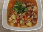 Wołowinę umytą osuszoną kroimy na średnią kostkę, skrapiamy octem i odstawiamy aby skruszała. Kroimy warzywa w małą kostkę. Na patelni na oleju podsmażamy mięso, jaki będzie zrumienione posypujemy mąką i chwilę podsmażamy. Wrzucamy do wcześniej przygotowanego bulionu wołowego i zaczynamy gotować na małym ogniu, na tej same patelni podsmażamy warzywa i dodajemy do garnka. Do gotującego się mięsa z warzywami dorzucamy przyprawy liść laurowy, ziele angielskie, pieprz i sól. Pozostawiamy na gazie na małym ogniu, aż do momentu kiedy mięso będzie miękkie, a warzywa prawie się rozpadną i dadzą piękny czerwony kolor zupie. Dodajemy pokrojone w kostkę ziemniaki, przykrywamy garnek pokrywką i po około 10 minutach wyłączamy gaz i zostawiamy przykrytą aby ziemniaki same "doszły" . Po tym czasie doprawiamy przecierem pomidorowym oraz papryką słodką i wędzoną w proszku i do swojego smaku solą i pieprzem. Zupa jest pyszna w dniu gotowania ale jeszcze lepsza na drugi dzień. Czasem dodaję 100 ml czerwonego wina ma wtedy piękny aromat lekko owocowy. Polecam i życzę smacznego