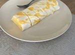 Kiedy omlet będzie gotowy, posyp go startym serem oraz szczypiorkiem i zwiń jak roladę.