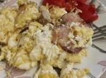 W trakcie smażenia cały czas mieszaj zawartość patelni za pomocą drewnianej łyżki. Kiedy jajka zaczynają się ścinać i uzyskasz odpowiednią konsystencję zestaw patelnię z płyty grzewczej.