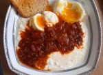 Zagotuj w garnku wodę, dodaj ocet. Jajka pojedynczo wybij do miseczki. Wodę w garnku zamieszaj łyżką, robiąc wir, jajko wlej w środek garnka. Gotuj przez 2,5 minuty (duże jajka 3 minuty) na płycie grzewczej. Jajko wyjmij przy użyciu łyżki cedzakowej, przełoż na środek jogurtu.