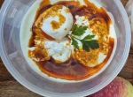 Na małej patelni roztop masło, dodaj paprykę w proszku. Ciepłym masłem polej jajka ułożone na jogurcie, całość posyp posiekanymi listkami mięty, solą oraz pieprzem.