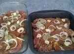 Zamarynowaną karkówkę przenieś do naczynia żaroodpornego, wymieszaj z cebulą, wstaw do piekarnika nagrzanego do 180°C i piecz w piekarniku pod przykryciem przez około 60–70 minut, aż mięso stanie się miękkie. Jeśli mięso będzie nadal twarde wydłuż czas pieczenia. Upieczoną karkówkę polej sosem, posyp szczypiorkiem, podawaj.