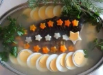 Gotowy bulion wylej na przygotowane wcześniej mięso karpia. Jak udekorować karpia w galarecie? Dodaj pokrojone w plastry marchewki i pietruszkę oraz listki natki pietruszki dla dekoracji.