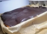 Góra: 1. Czekoladę rozpuszczamy z 5 gramami oleju w kąpieli wodnej. 2. Rozpuszczoną czekoladę wylewamy na wierzch ciasta. Gdy chwilę przestygnie, ponownie wkładamy do lodówki na ok. 30min.