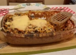 Zapiekanka mięsna z kolorowymi warzywami i makaronem kokardki.
