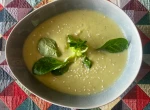 Na maśle z oliwą podsmażamy brokuła z cebulą. Dodajemy posiekany czosnek i zalewamy bulionem. Gdy brokuł zmięknie wrzucamy liście szpinaku i blendujemy. Podajemy z grzanką z serem pleśniowym i bazylią