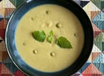 Przygotowujemy wywar. Drobno pokrojony czosnek i cebule podduszamy na patelni na łyżce oleju. Dosypujemy groszek i czynność powtarzamy przez kolejne 10-15 min. Wlewamy wywar, ilość uzależniając od tego, jaką konsystencję chcemy uzyskać. Wszystko gotujemy, aż groszek będzie zupełnie miękki, czyli ok. 20 min. Następnie zupę należy nieco ostudzić, zmiksować, doprawić solą i pieprzem. Ponadto dodajemy sok z połówki cytryny, a podajemy z jogurtem naturalnym, lub śmietaną