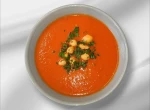 Krem z pomidorów na bazie młodych warzyw z dodatkiem łyżki śmietany, podany z bazylią.