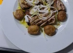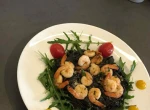 - Krewetki wyławiam łyżką cedzakową i studzę. Do sosu dorzucam posiekaną miętę i winogrona przekrojone na pół.