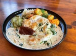 Na patelnię dodaj ostatnią łyżkę oliwy, cebulę oraz masło, smaż do lekkiego zarumieniania, dodaj suszone pomidory, kawałki kurczaka, zalej śmietaną i na średniej mocy płyty grzewczej duś do zagotowania, dodaj szpinak, wymieszaj z sosem.