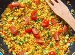 Przygotować kaszę kuskus zgodnie z instrukcją na opakowaniu. Ja zazwyczaj zalewam ją bulionem lub osoloną wodą na wysokość 1 cm ponad kaszę . Odstawić do wchłonięcia płynu. Na patelni rozgrzać oliwę i wrzucać w kolejności w odstępach 2-3 minutowych: pokrojoną w kostkę cebulę, po chwili paprykę, kostki dyni, ćwiartki brukselek. Jak już warzywa są miękkie to wsypujemy kaszę i na sam koniec poszatkowaną natkę pietruszki. Wszystko dokładnie wymieszać i doprawić solą i pieprzem.
