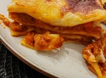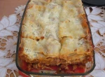 Robimy sos beszamelowy: masło roztapiamy, dodajemy mąkę i robimy jasną zasmażkę, dolewamy mleko i zagotowujemy, aż sos nam zgęstnieje, doprawiamy do smaku pieprzem, solą i gałką. Do natłuszczonego naczynia na spód dajemy sos, układamy płaty lazanii, znowu dajemy sos. Cebulę i czosnek drobno siekamy, podsmażamy na oliwie. Dodajemy mięso mielone, doprawiamy do smaku pieprzem i solą. Pomidory przelewamy gorącą wodą, obieramy ze skórki, drobno siekamy i dodajemy do mięsa, dodajemy oregano i bazylię i chwilę jeszcze smażymy. Na płaty lazanii z sosem dajemy połowę mięsa mielonego. Znowu układamy płaty lazanii smarujemy sosem beszamelowym. Dajemy pozostałe mięso mielone. I dajemy ostatnią warstwę lazanii smarujemy sosem Na wierzchu układamy plasterki sera żółtego Zapiekamy około 45 minut w temp. 200 stopni. Przed podaniem po wierzchu polewamy ketchupem