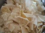 Przygotuj stolnicę i posyp ją mąką. Odkrawaj po kawałku ciasta (resztę za każdym razem pozostawiając pod przykryciem, aby nie wyschło) i cienko rozwałkuj. Posyp na wierzchu mąką. Każdy płat pokrój na paski o szerokości około 1-2 centymetrów, a następnie w kwadraty lub romby.