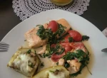 Następnie na tej samej patelni i pozostałym maśle rozpuść ser gorgonzola. Dodaj śmietanę kremówkę wymieszaną z łyżeczką mąki, następnie szpinak i gotuj na małej mocy kilka minut, do momentu, aż sos będzie gęsty. Dopraw pieprzem i solą do smaku. Porcje łososia wykładaj na ciepłe talerze, polewając ok. 2 łyżkami sosu, i podawaj gorące z porcją ryżu.