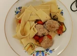 Następnie na patelnię wrzuć ugotowany makaron, dodaj klopsiki i cukinię.
