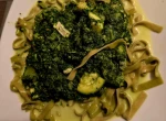 Szpinak możemy wcześniej rozmrozić i odsączyć z wody, albo od razu wrzucamy na patelnię (w tym drugim przypadku podgrzewamy tak długo, aż będzie całkiem rozmrożony i zbędna woda nam odparuje). W garnku gotujemy dużą ilość wody, gdy się zagotuje solimy i wrzucamy makaron (ja używam tagliatelle w formie gniazd, 10 sztuk starcza na 2 bardzo głodne osoby, ale 3-4 na niedużą przystawkę), gotujemy według instrukcji na opakowaniu. Do szpinaku dodajemy 2 łyżki masła i dokładnie mieszamy. Dodajemy posiekany czosnek, sól, pieprz i pół startej gałki muszkatołowej. W miseczce mieszamy jogurt kozi z jajkiem, do momentu, w którym się dokładnie połączą. Mieszankę dodajemy do szpinaku, mieszamy i dodajemy ugotowany, odcedzony makaron. Mieszamy jeszcze raz i całość wstawiamy do piekarnika nagrzanego do 180 stopni na 20-25 minut, aż się zapiecze.