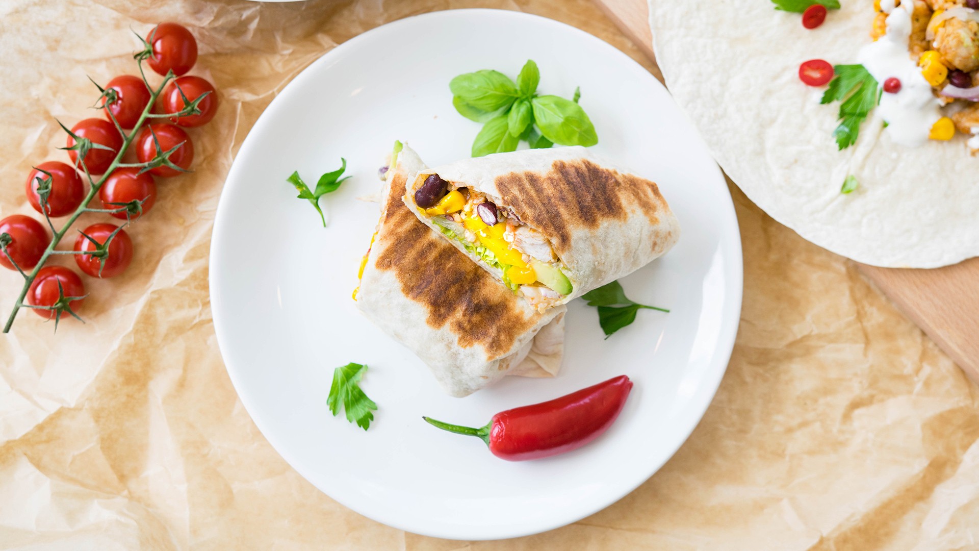 Podstawą meksykańskiego przysmaku są pszenne placki. Resztę składników możesz wybrać wedle własnych upodobań. Ja wybrałem delikatne mięso z indyka i kilka warzyw, które stworzyły barwny farsz. Połączenie chrupiącej czerwonej cebuli, słodkich ziaren kukurydzy, czerwonej fasoli i soczystych pomidorów smakuje wyśmienicie, a do tego pięknie prezentuje się na talerzu.