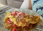 Cebulę kroimy w piórka i szklimy na łyżce masła klarowanego. Przekładamy do miseczki. Pomidory kroimy. Szparagi dokładnie obieramy. Gotujemy w wodzie z dodatkiem soli i łyżeczki cukru. Kroimy na kawałki o długości około 5 cm. Żółtka ucieramy z solą, białym pieprzem, łyżka mleka i mąki. Białka ubijamy na sztywno. Białka delikatnie łączymy z żółtkami. Na małej patelni rozgrzewamy łyżkę masła klarowanego i wylewamy masę jajeczną. Gdy spód i boki omletu się zetną układamy szparagi, kawałki pomidorów i przesmażona cebulkę. Delikatnie przy użyciu dwóch noży składamy omlet na pół. Dekorujemy reszta szparagów i posypujemy posiekana dymką.