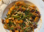 Pad thai – aromatyczny makaron z kuchni tajskiej z tofu smażonym na złoto, chrupiącymi kiełkami fasoli mung i masą orzeszków ziemnych.