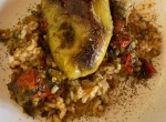 Podgotuj wstępnie kaszę i odcedź. W tym czasie pokrój cebulę w kostkę i zeszklij na oleju wraz z przeciśniętym przez praskę czosnkiem, dodaj mięso mielone i podsmaż 5 minut. Dodaj drobno pokrojone pieczarki i smaż kolejne 5 minut. Dopraw solą i pieprzem, sosem sojowym i czarnuszką. Dodaj kaszę i duś na małym ogniu, dolej lampkę wina i szklankę bulionu warzywnego. Poczekaj aż kasza wchłonie płyn. Przygotuj papryki - odetnij "przykrywki" i wydrąż środki. Umieść w małych naczyniach ceramicznych, nałóż kaszę i przykryj. Wstaw do nagrzanego piekarnika (180 st.C) na około 30 minut. Podawaj gorące.