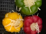 Papryka nadziewana jest warstwowo na przemian: kasza gryczana, pieczarki i mielona wołowina z cebulką. Wszystko pod kołderką sera. Całość zapiekana.