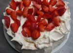 Białko ubić na sztywno. Małymi porcjami dodać cukier, cukier waniliowy oraz aromat waniliowy, stale mieszając. W trakcie ucierania szybko dodać mąkę kartoflaną. Blachę uniwersalną wyłożyć papierem do pieczenia. Na środku blachy uniwersalnej zrobić z masy kupkę z wgłębieniem o średnicy 20 cm i natychmiast piec jak podano. Ostudzić bezy. Krótko przed podaniem ubić śmietanę na sztywno i przełożyć ją do "miseczki bezowej". Przyozdobić malinami.