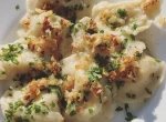 W dużym garnku na płycie grzewczej zagotuj osoloną wodę. Pierogi wrzucaj partiami (po 8–10 sztuk) do wrzącej wody. Gotuj na małym ogniu, aż wypłyną na powierzchnię, a następnie jeszcze przez około 2–3 minuty. Wyjmuj łyżką cedzakową i układaj na talerzu, lekko skrapiając masłem, aby się nie posklejały.