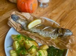 Umyte ziemniaki kroimy na ćwiartki, następnie podpiekamy na patelni na oleju około 5-6 minut, tak aby się zarumieniły. Przekładamy je do naczynia żaroodpornego, doprawiamy solą i pieprzem oraz dodajemy pokrojona cebulę. Miękkie masło łączymy z pokrojonymi ziołami, solą, czosnkiem i pieprzem, dokładnie mieszamy. Pstrągi myjemy, osuszamy, nacinamy skórę w kilku miejscach nożem i nacieramy przygotowanym masłem, również w środku, ryby skrapiamy sokiem z cytryny. Na ziemniaki układamy pstrągi, danie zawijamy w folię aluminiową i zapiekamy w nagrzanym piekarniku w temperaturze 180 *C, przez około 30-40 minut, po 20 minutach ściągamy folie aluminiową aby płyny odparowały. Po wyjęciu z piekarnika układamy kilka przekrojonych pomidorków, posypujemy świeżym tymiankiem oraz skrapiamy rybę sokiem z cytryny, podajemy ciepłe z dipami jogurtowymi. Smacznego.
