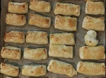 Ciasto francuskie pokrój w kwadraty, na środku połóż łyżkę farszu i zawiń w trójkąty. Kiedy wszystkie paszteciki będą już gotowe, posmaruj je delikatnie jajkiem i piecz w piekarniku, w temperaturze 180°C, aż nabiorą złocistego koloru.