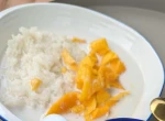 Na talerzu rozsmaruj 3-4 łyżki musu z mango, następnie dodaj porcję ryżu, posyp całość sezamem, wiórkami kokosowymi i pistacjami, a na koniec udekoruj pokrojonym w kostkę mango.
