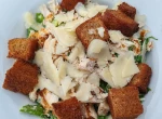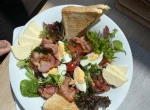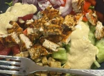 Filet obsypujemy ziołami prowansalskimi i smażymy na oleju kokosowym do uzyskania złotego koloru, następnie kroimy w paski. Pomidory kroimy w ćwiartki, podobnie jak ugotowane na twardo jajka. Na talerzu rozkładamy mix sałat, pomidory, jajka i kurczaka. Osobno mieszamy jogurt z solą i przeciśniętym przez praskę ząbkiem czosnku. Sól i czosnek dajemy do smaku. Gotowym sosem polewamy sałatkę. Na koniec posypujemy całość pestkami słonecznika. Fantastycznie pasuje do tego pieczywo czosnkowe. Smacznego.