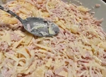 Piersi z kurczaka, myjemy kroimy w kostkę, doprawiamy solą i pieprzem, podsmażamy na odrobinie oleju; Możemy zamienić drób na wersję z wędzonym kurczakiem lub upiec mięso w piekarniku w opcji grill lub ustawić funkcję PerfectChef w piekarniku Bosch. Dzięki temu mięso będzie idealnie upieczone i jednocześnie soczyste w środku.