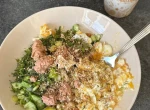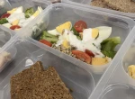 Na wierzchu ułóż pokrojoną cebulkę dymkę, tuńczyka i przekrojone jajko. Tak przygotowaną sałatkę zabierz ze sobą do szkoły.