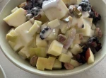 - Owoce dokładnie umyj i obierz. Jabłko i gruszkę pokrój w półplastry, ananasa w kostkę, a winogrona przetnij na pół. Orzechy drobno posiekaj.