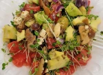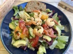 Kolorowa sałatka z chrupiącej sałaty, soczystych pomidorków, kremowego awokado i charakternej czerwonej cebuli. Kompozycja zwieńczona jest rozpływającym się w ustach delikatnym jajkiem i słodkawym sosem winegret. Sałatkę podaję z podpieczoną bagietką.