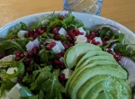 Składniki sałatki połącz – pokrojonego kurczaka, kawałki pomarańczy, rukolę, pestki granatu. Całość skrop oliwą i posyp orzechami.
