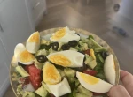 Dokładnie myjemy osuszamy suszarką do sałaty. Pomidorki myjemy kroimy na pół, cebulę kroimy w piórka, ogórka i rzodkiewki w krążki, jajka w ósemki. Na talerzu układamy sałatę i pozostałe warzywa, jajka, doprawiamy do smaku solą i pieprzem. Całość polewamy olejem rzepakowym. skrapiamy sokiem z cytryny.