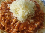 Mięso i posiekaną cebulę podsmażyć na rozgrzanym oleju, ciągle mieszając. Mięso rozdrobnić, aby nie kleiło się w duże kawałki, tylko było kruche. Dodać pomidory, posiekany czosnek, łyżkę oliwy i gotować, aż sos zgęstnieje. Doprawić solą i pieprzem. Makaron ugotować „al dente” według przepisu na opakowaniu, dodając łyżkę oliwy, aby się nie posklejał. Ugotowany makaron dokładnie wymieszać z sosem i przed podaniem polać każdą porcję zielonym Pesto i posypać parmezanem.