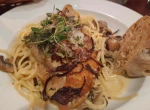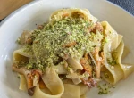 Całość smażymy na małym ogniu przez ok. 4 minuty. Następnie dodajemy wino, doprowadzamy do wrzenia i gotujemy wszystko razem przez kolejne 4 minuty. Na koniec sos doprawiamy solą i pieprzem oraz dodajemy do niego makaron ugotowany al dente.