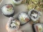 1. Wodę z ryżem zagotowujemy i przykrywamy aż woda wsiąknie w ryż. 2. W rondelku rozpuszczamy cukier w occie ryżowym. Gotową zaprawę łączymy z ryżem. 3. Łososia, Surimi, Ogórka, i Paprykę kroimy tak aby miały po 0,5 cm średnicy. 4. Liście nori układamy na macie bambusowej matową stroną do góry i na niej rozkładamy 1-2 garści ryżu. Smarujemy nim dosłownie odrobiną wasabi po czym układamy wybrane składniki z punktu 3. Może być to jeden składnik lub kombinacyjnie 2,3,4. 5. Sushi zawijamy szybkim ruchem. Gotowe rolki kroimy na około 3 cm kawałki. GOTOWE!!! :)